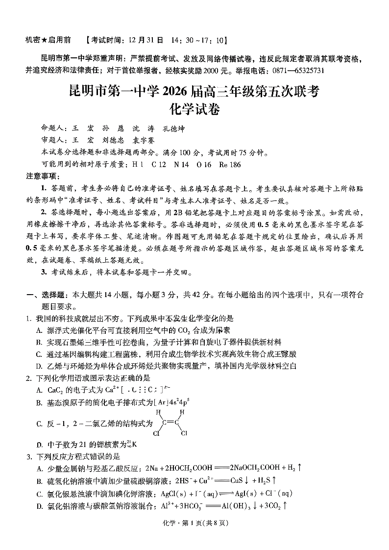 高三化学+答案--云南省昆明市第一中学2026届高三年级第五次联考