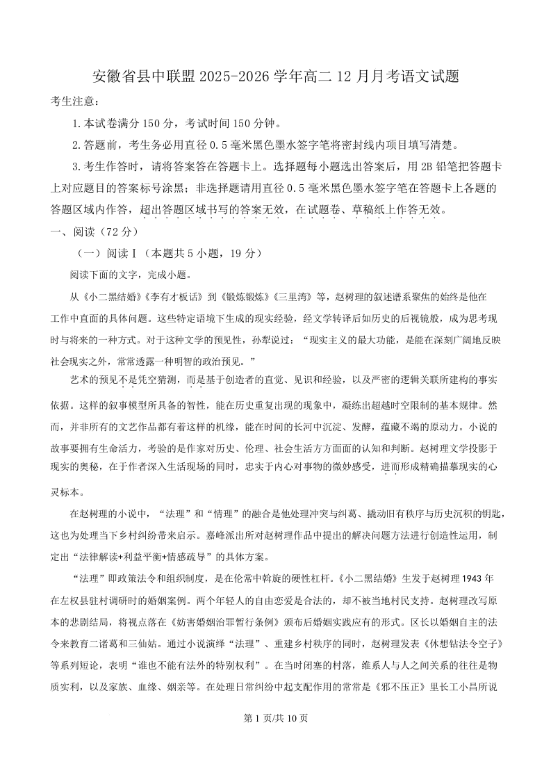 高二语文(原卷版)--安徽省县中联盟2025-2026学年高二上学期12月月考