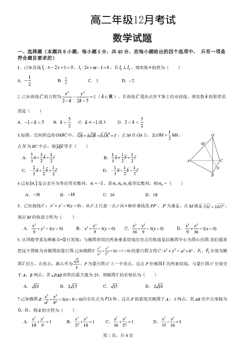 高二数学--河北省保定市部分高中2025-2026学年高二上学期12月月考