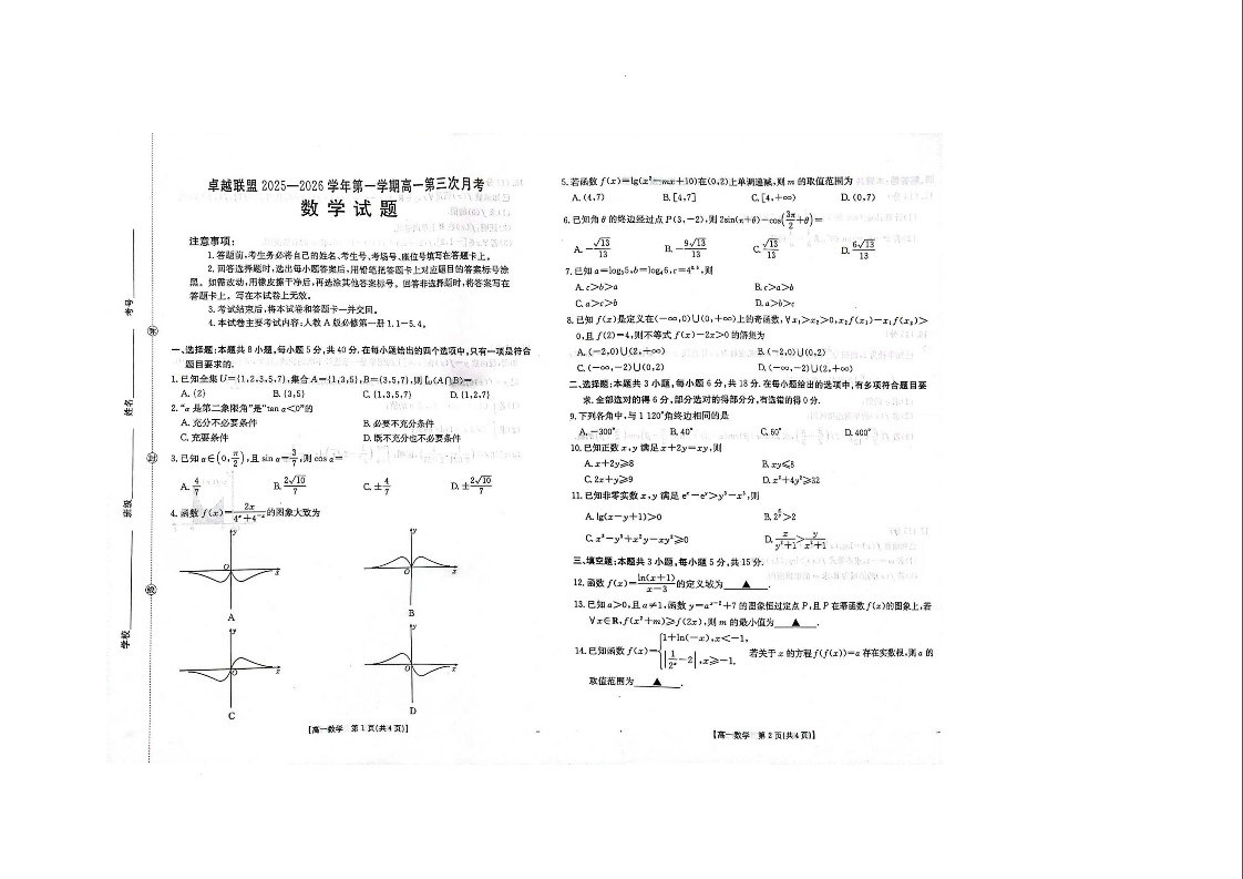 高一数学--河北省邢台市卓越联盟2025-2026学年高一上学期1月月考