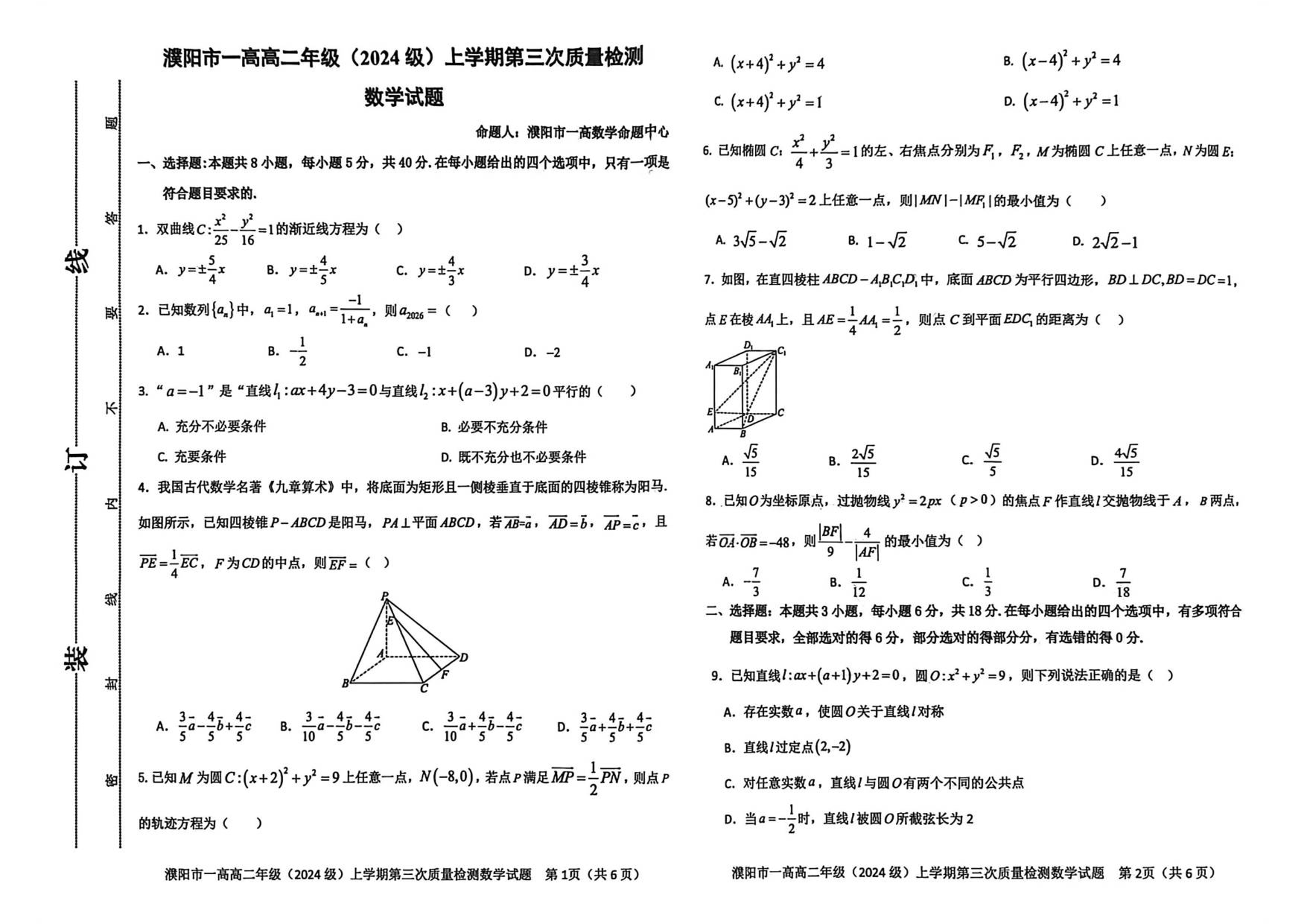 高二数学--河南省濮阳市第一高级中学2025-2026学年高二上学期1月月考