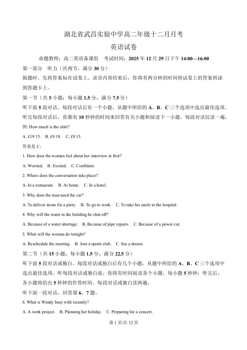 高二英语(原卷版)--湖北省武汉市武昌实验中学2025-2026学年高二上学期12月月考