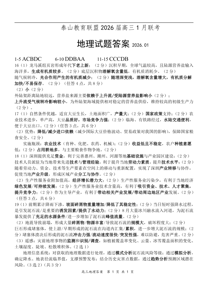 高三地理答案--山东省实验中学泰山联盟2026.1联考