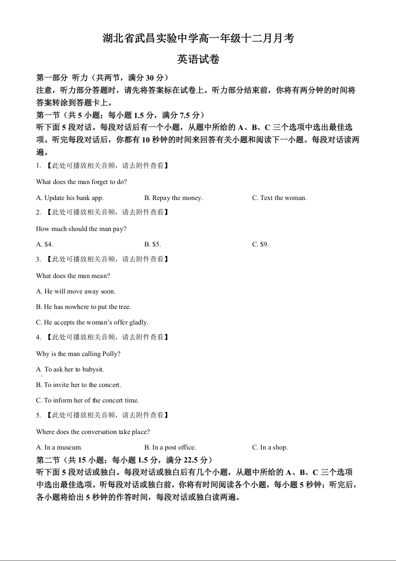 高一英语(原卷版)--湖北省武汉市武昌实验中学2025-2026学年高一上学期12月月考