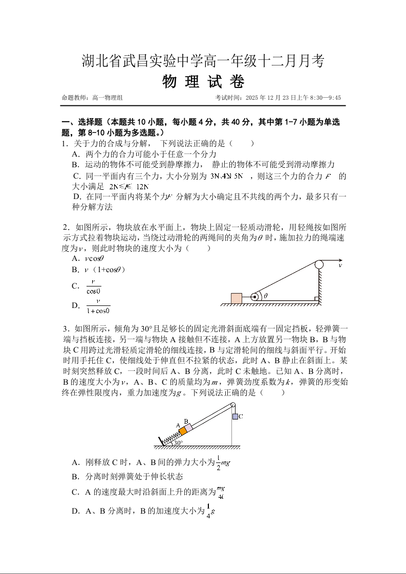 高一物理+答案--湖北省武汉市武昌实验中学2025-2026学年高一上学期12月月考