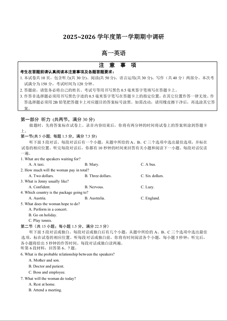高一英语+答案--江苏省盐城市多校2025-2026学年高一上学期期中考试