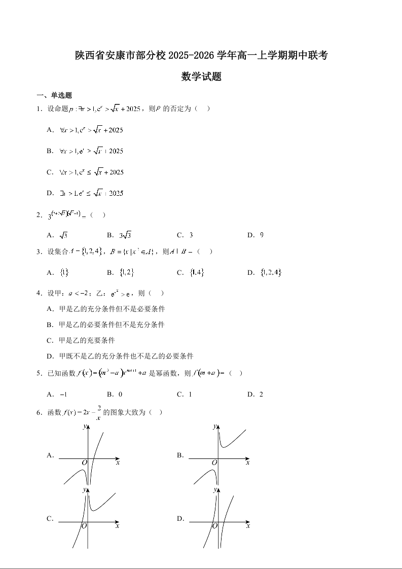 高一数学+答案--陕西省安康市2025-2026学年高一上学期期中联考