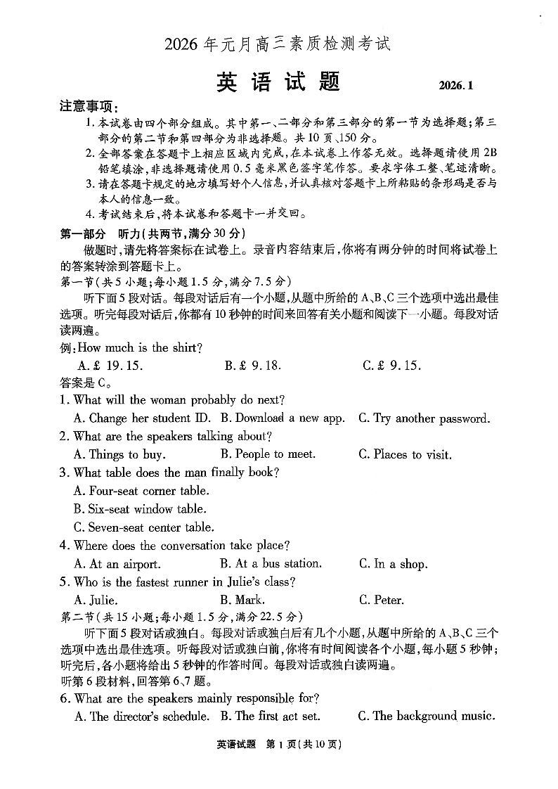 高三英语--安徽六校教育研究会2026届元月高三素质检测考试