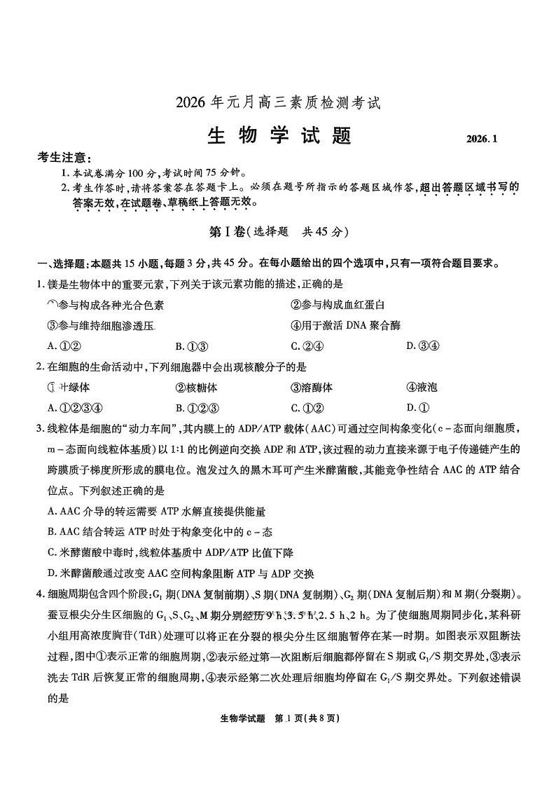 高三生物--安徽六校教育研究会2026届元月高三素质检测考试