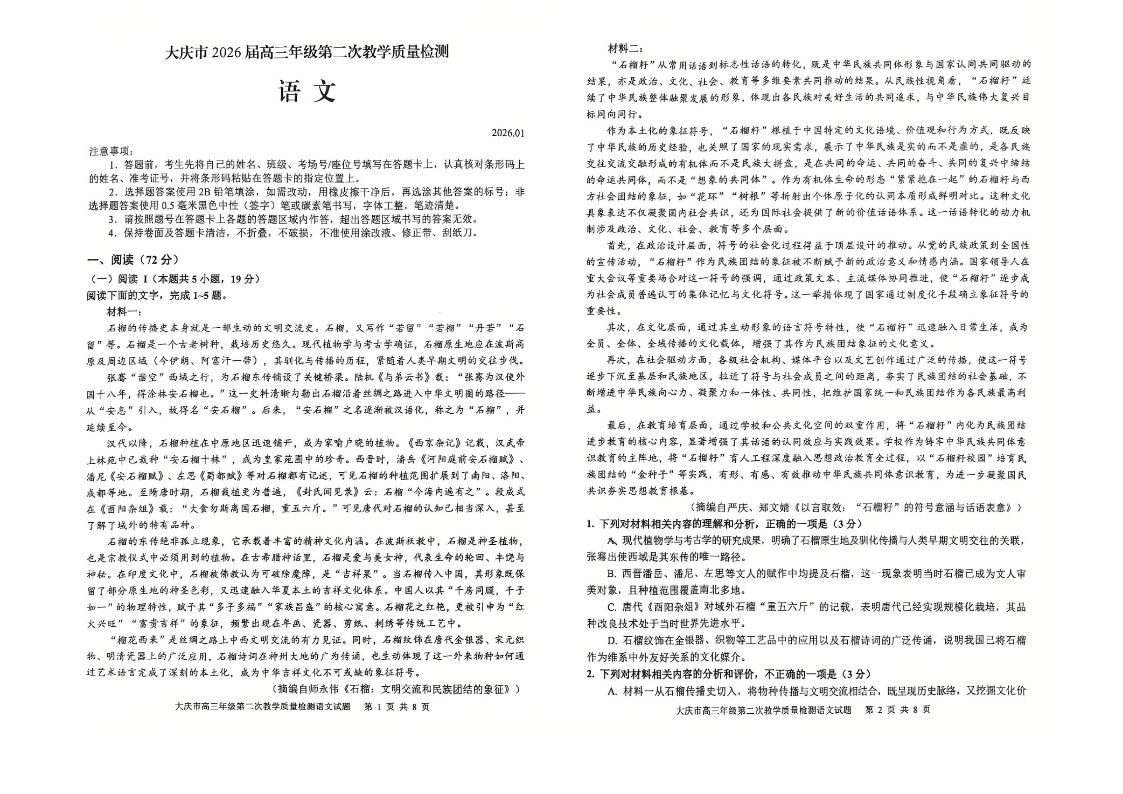 高三语文--黑龙江省大庆市2026届高三第二次教学质量检测(大庆二模)