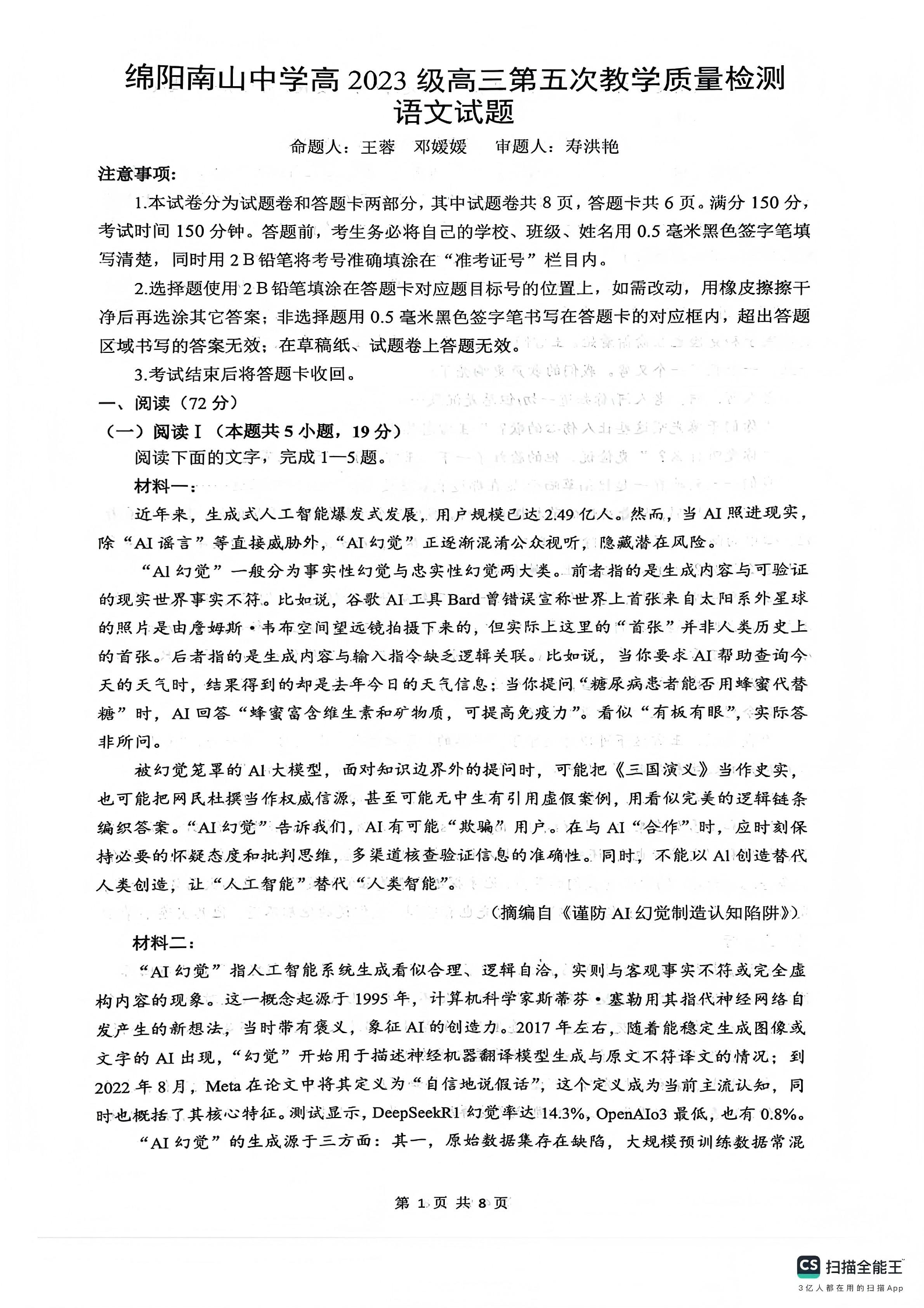 高三语文--四川省绵阳南山中学高2023级高三第五次教学质量检测
