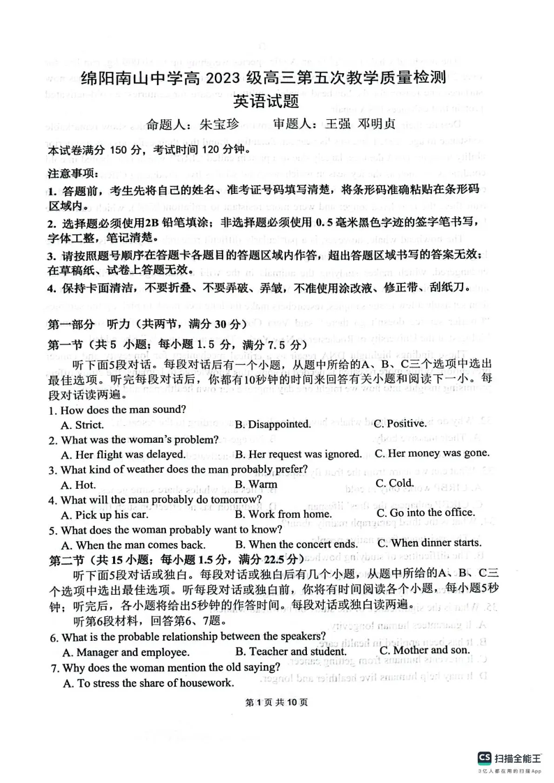 高三英语--四川省绵阳南山中学高2023级高三第五次教学质量检测