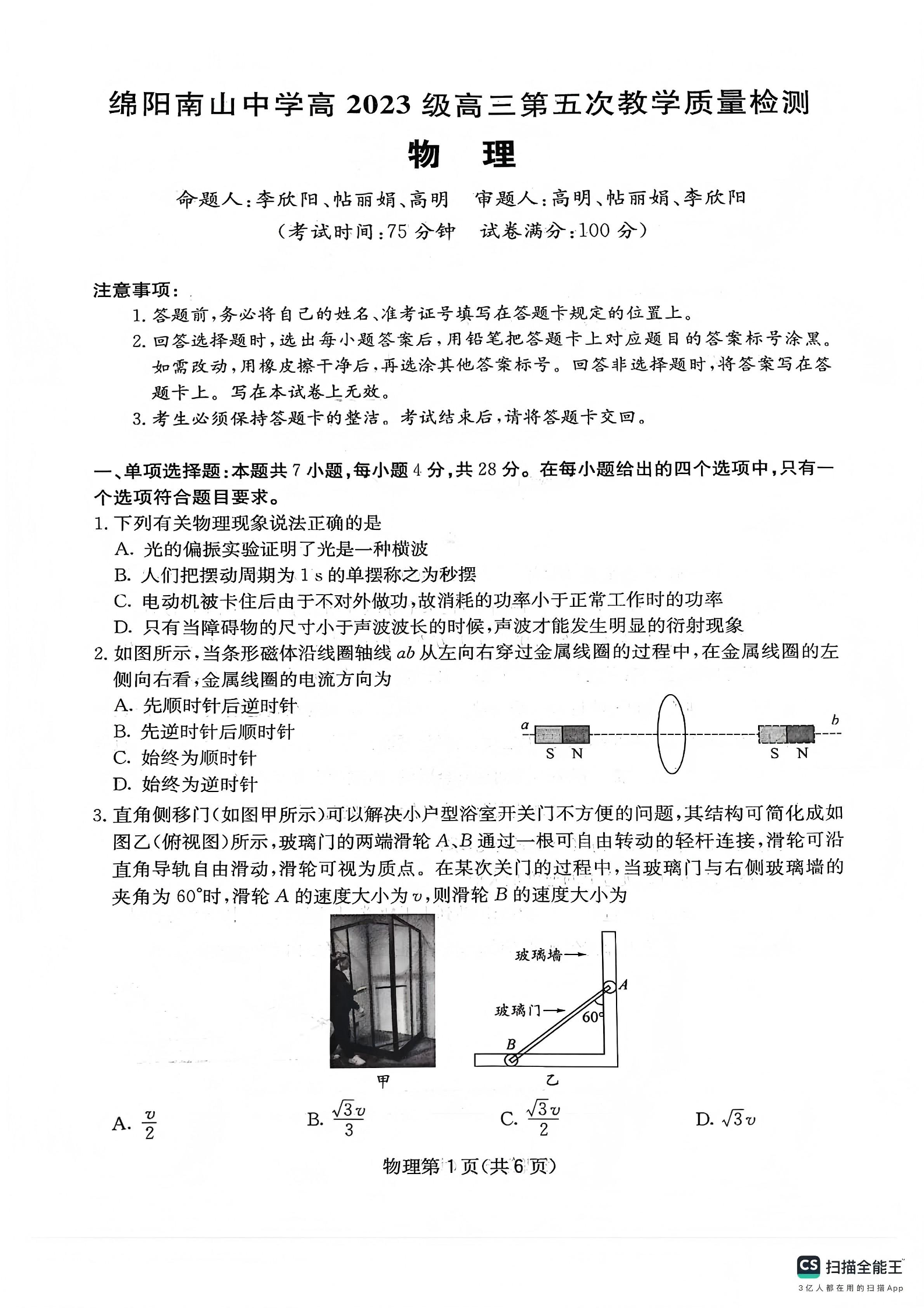 高三物理--四川省绵阳南山中学高2023级高三第五次教学质量检测