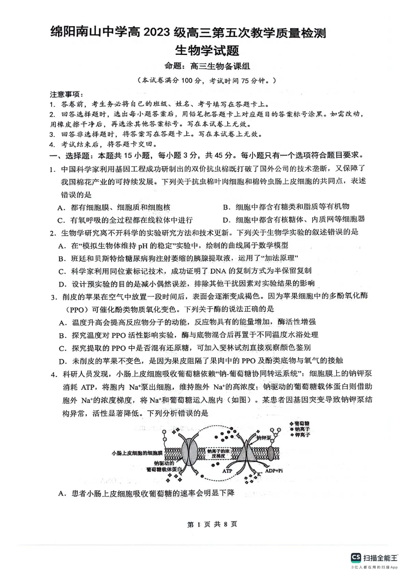高三生物--四川省绵阳南山中学高2023级高三第五次教学质量检测