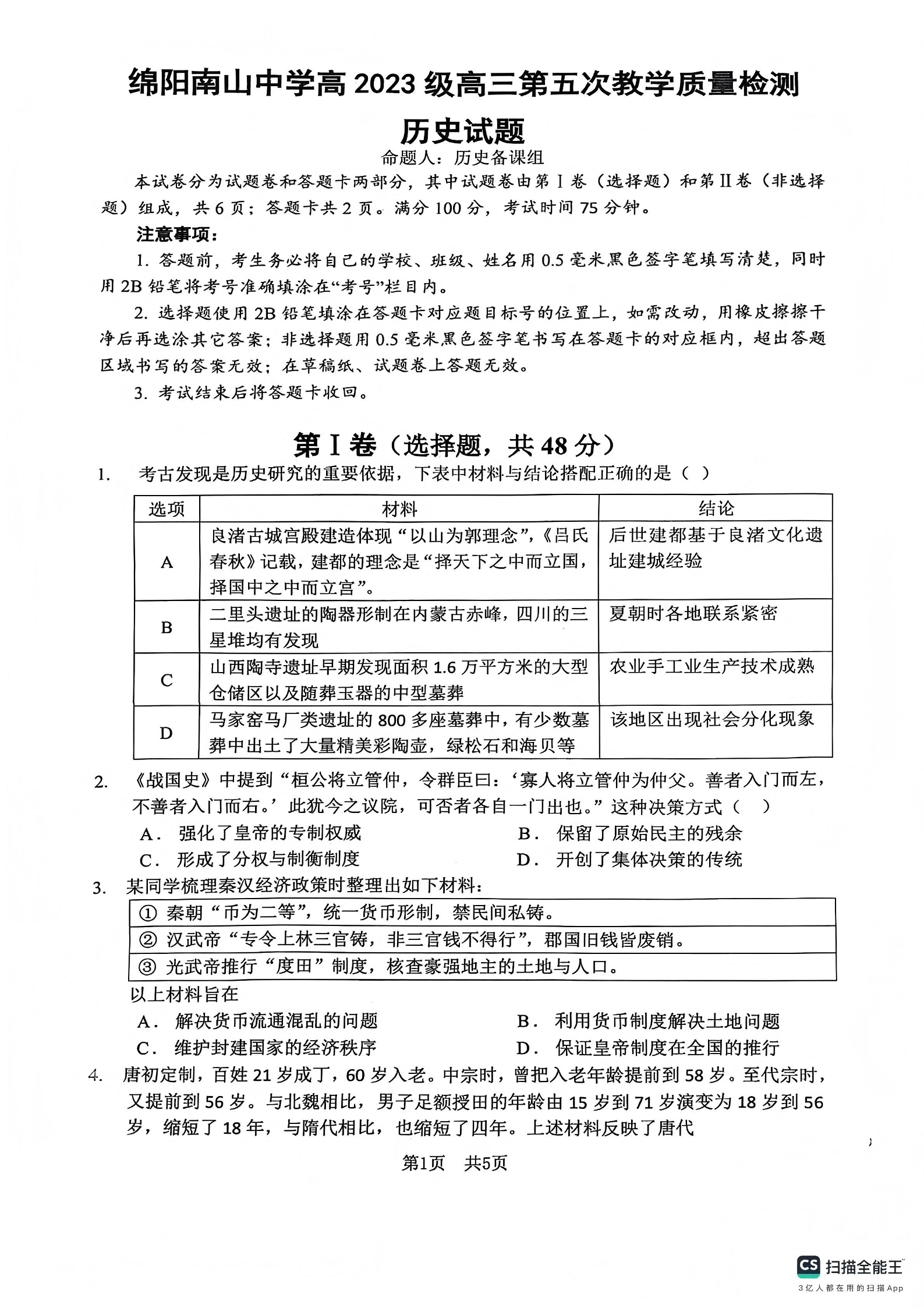 高三历史--四川省绵阳南山中学高2023级高三第五次教学质量检测
