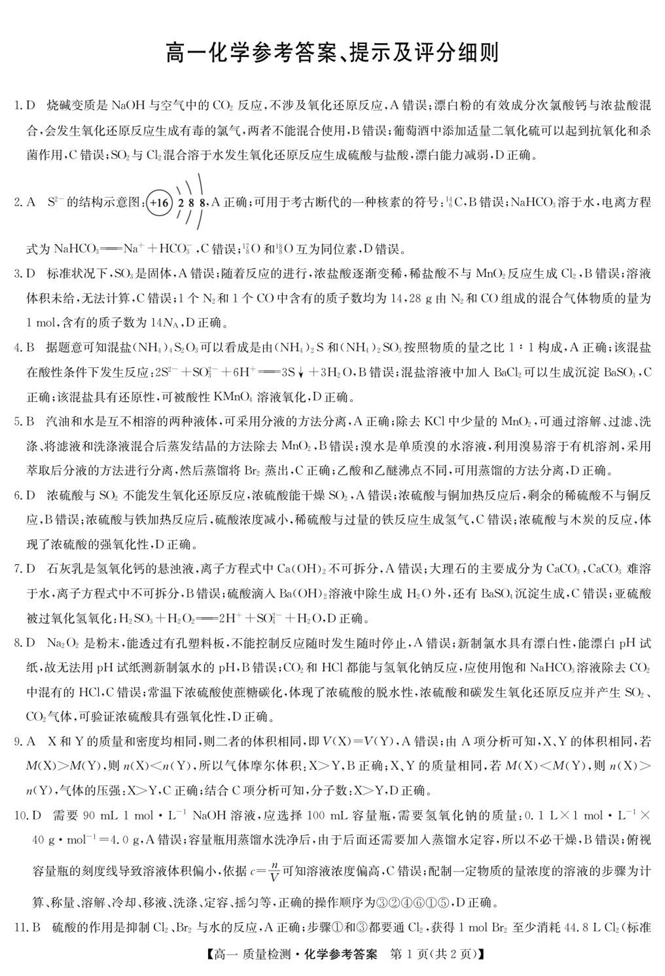 高一化学答案--甘肃省白银市靖远县第一中学2025-2026学年高一上学期12月月考