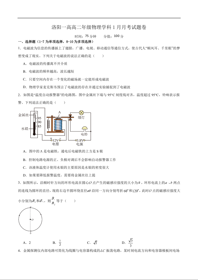 高二物理--河南省洛阳市第一高级中学2025-2026学年高二上学期1月月考