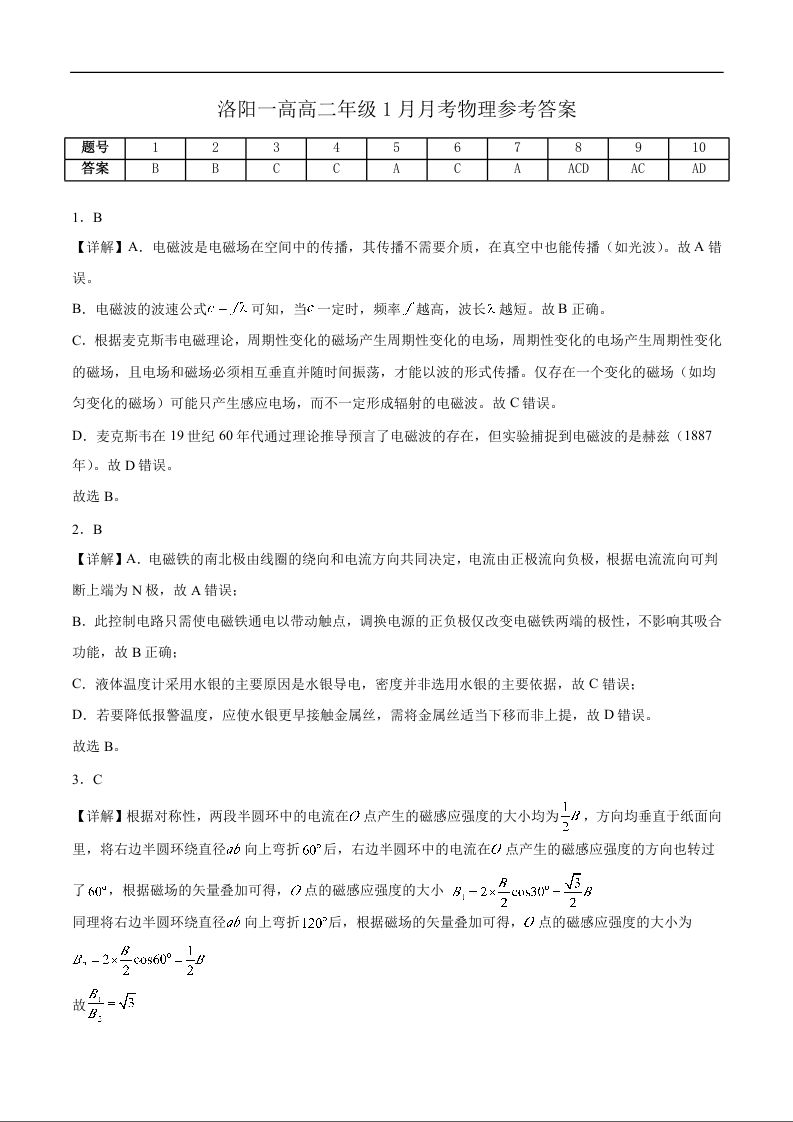 高二物理答案--河南省洛阳市第一高级中学2025-2026学年高二上学期1月月考