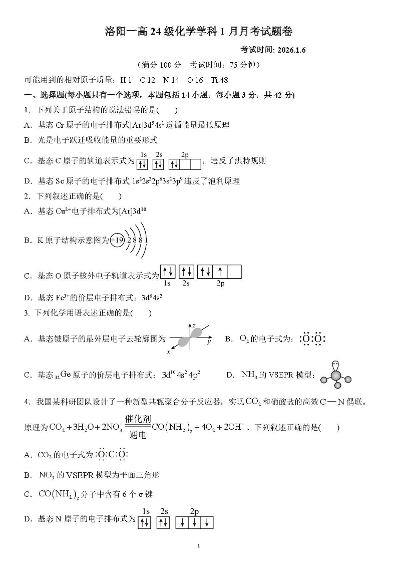 高二化学+答案--河南省洛阳市第一高级中学2025-2026学年高二上学期1月月考