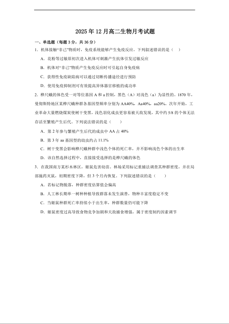 高二生物+答案--湖南省岳阳市汨罗市第二中学2025-2026学年高二上学期12月月考