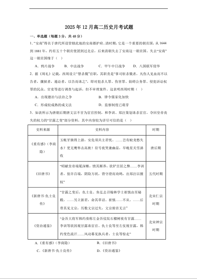 高二历史+答案--湖南省岳阳市汨罗市第二中学2025-2026学年高二上学期12月月考