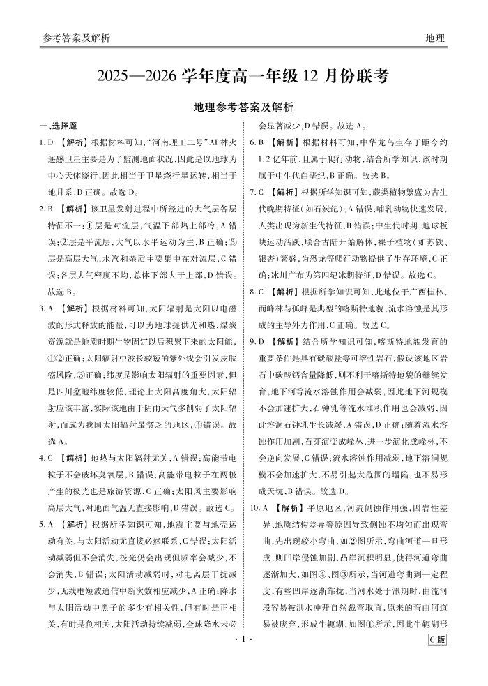 高一地理答案C版--广东省衡水金卷2025—2026学年度高一年级12月份联考