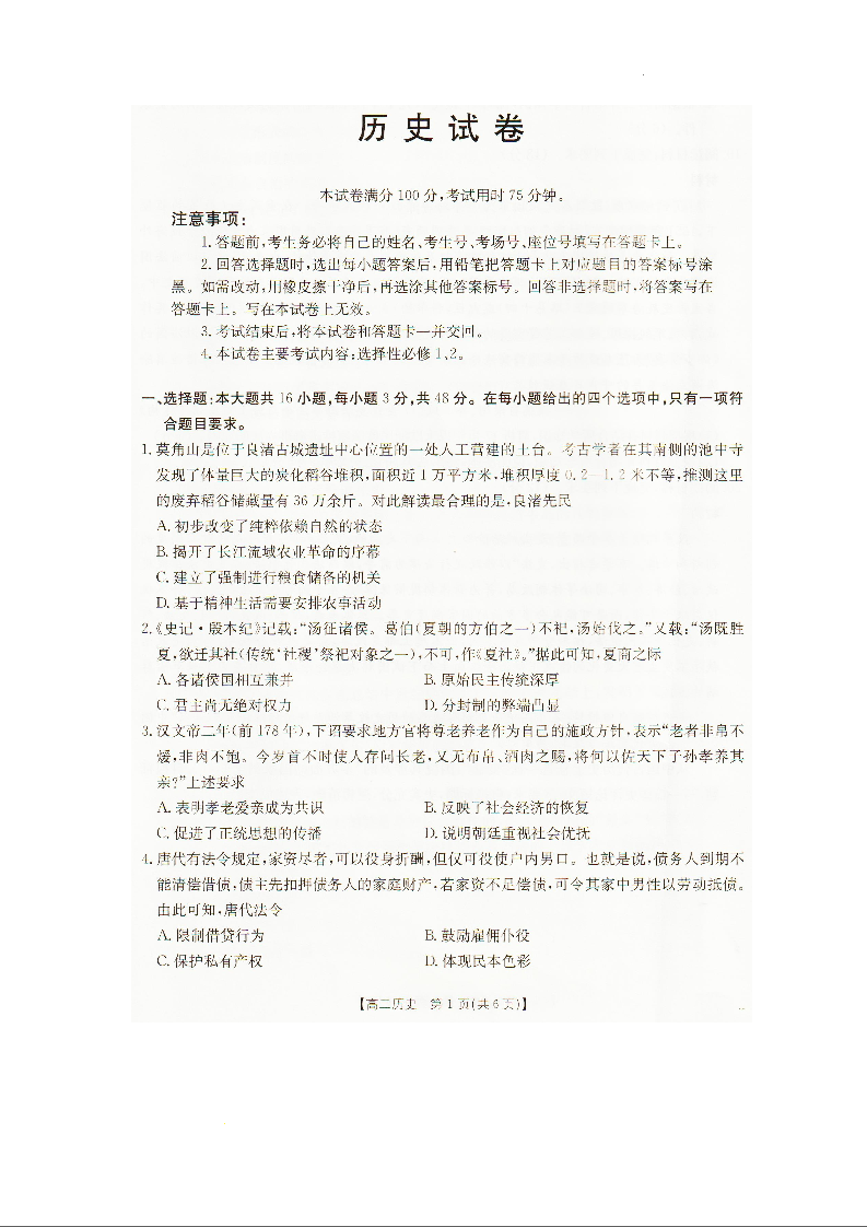 高二历史--辽宁省抚顺市六校协作体2025-2026学年高二上学期期末联考