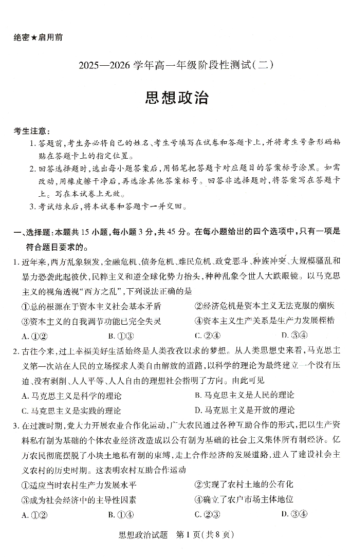 高一政治--河南省豫北名校2025-2026学年高一上学期阶段性测试(二)