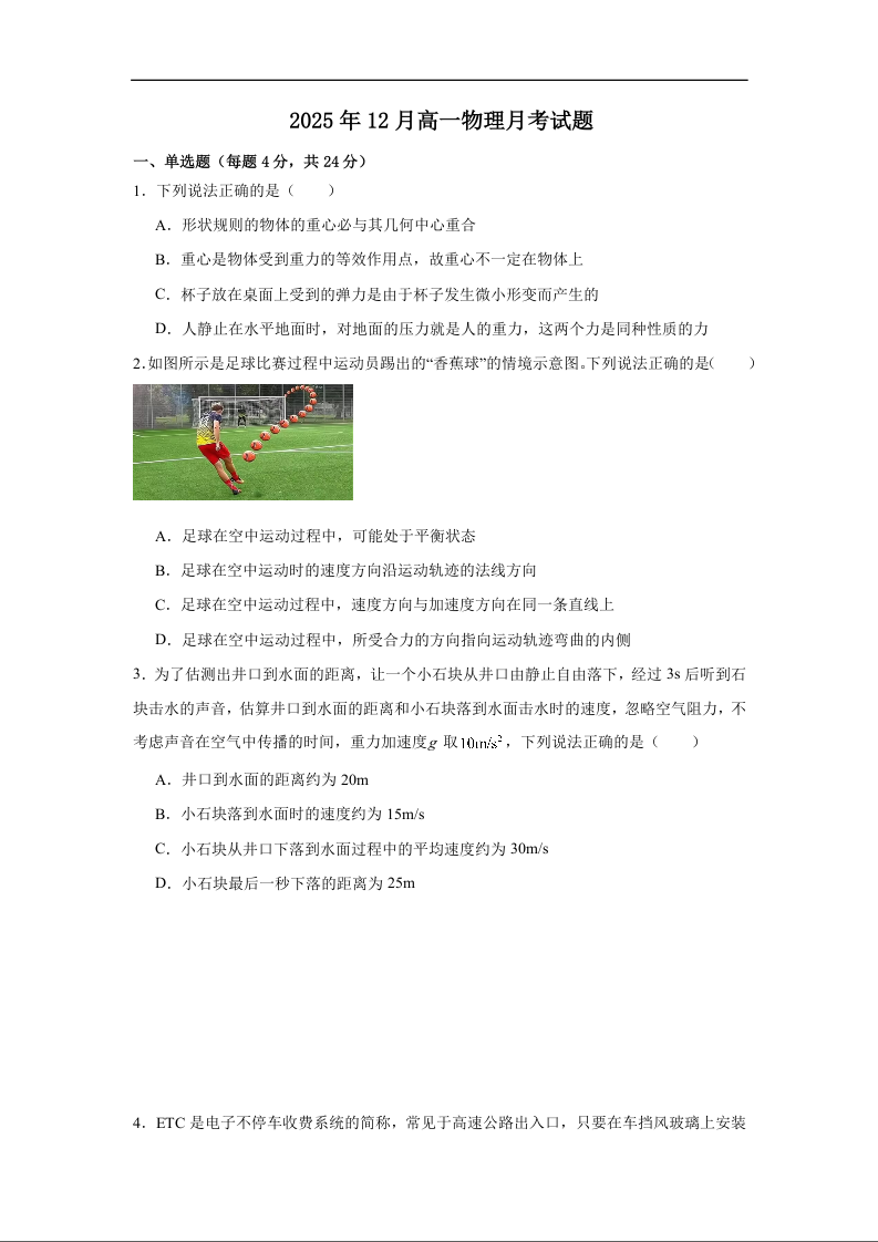 高一物理+答案--湖南省岳阳市汨罗市第二中学2025-2026学年高一上学期12月月考