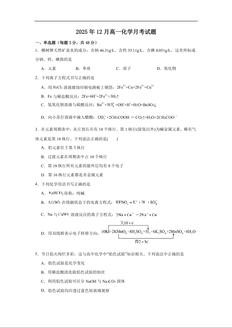 高一化学+答案--湖南省岳阳市汨罗市第二中学2025-2026学年高一上学期12月月考