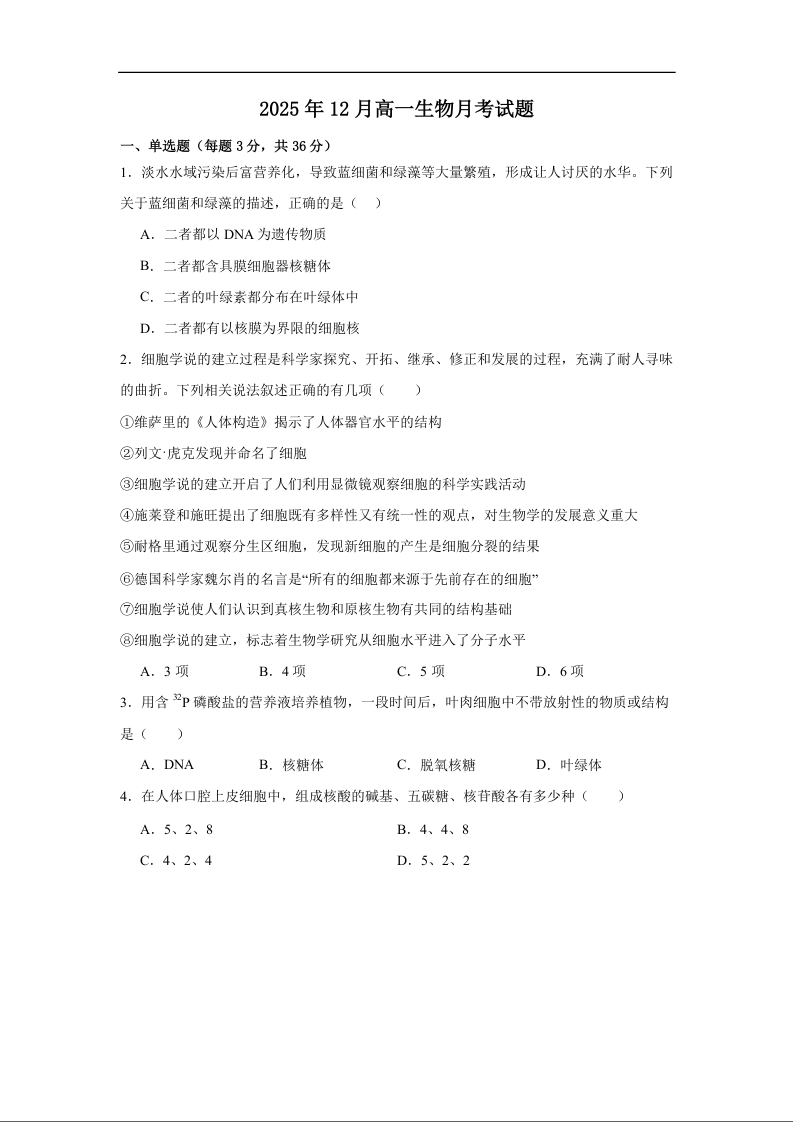 高一生物+答案--湖南省岳阳市汨罗市第二中学2025-2026学年高一上学期12月月考