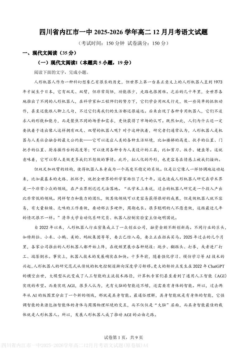 高二语文(原卷版)--四川省内江市第一中学2025-2026学年高二上学期12月月考