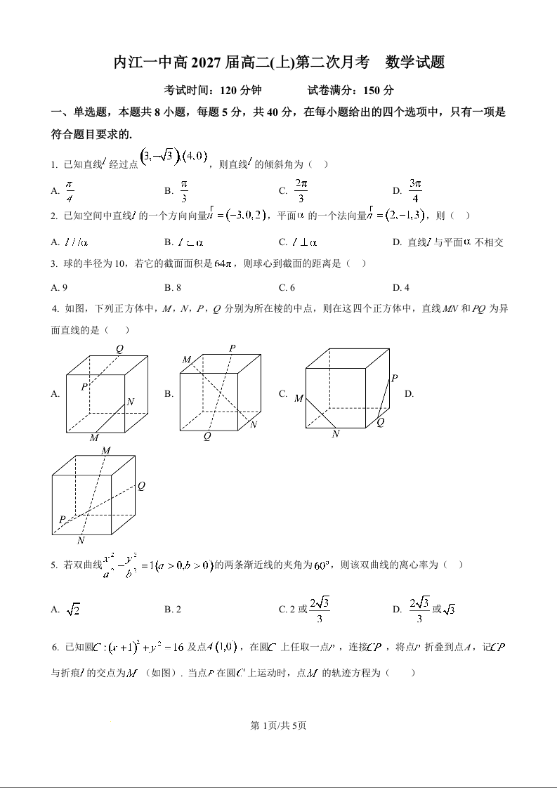 高二数学(原卷版)--四川省内江市第一中学2025-2026学年高二上学期12月月考
