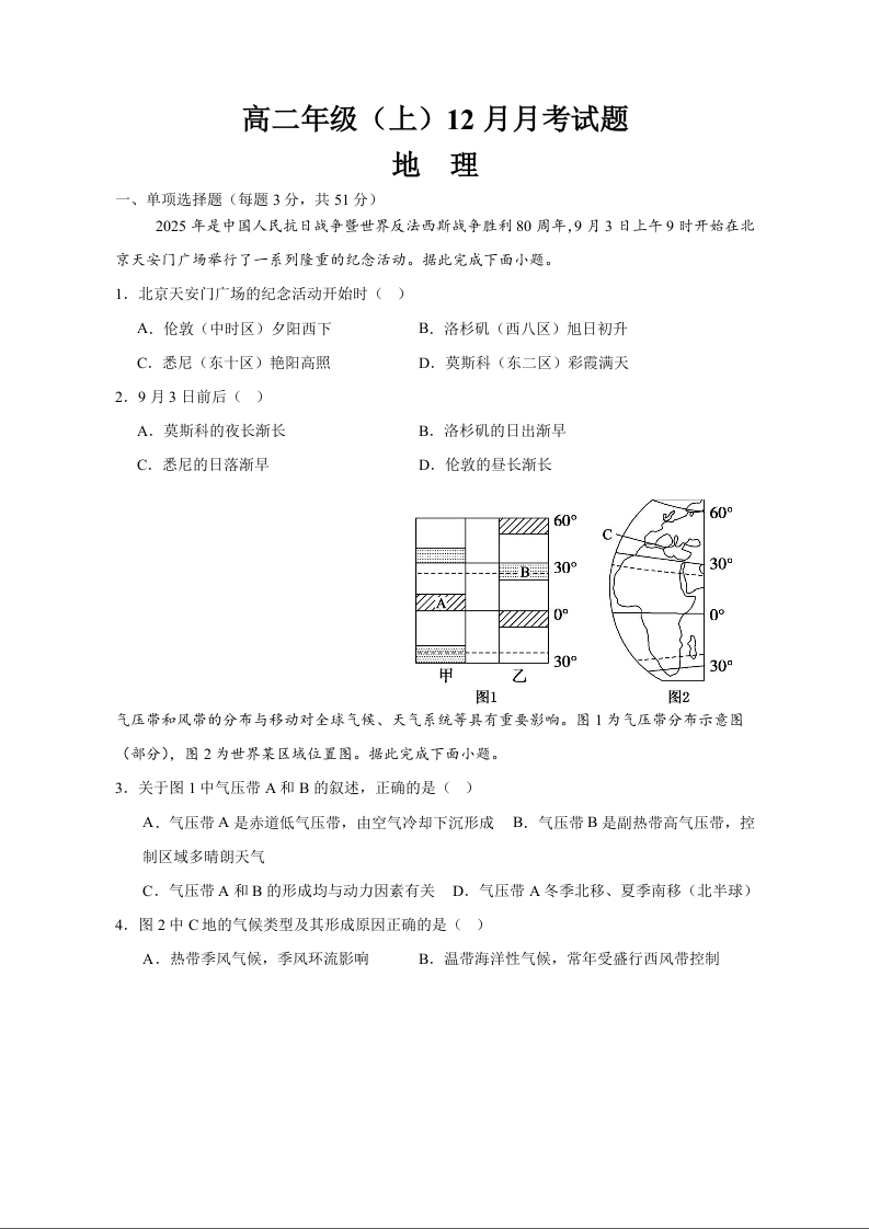 高二地理+答案--四川省内江市第一中学2025-2026学年高二上学期12月月考