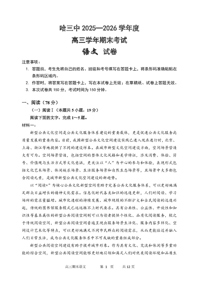高三语文--黑龙江省哈尔滨市第三中学2026届年高三上学期1月期末考试