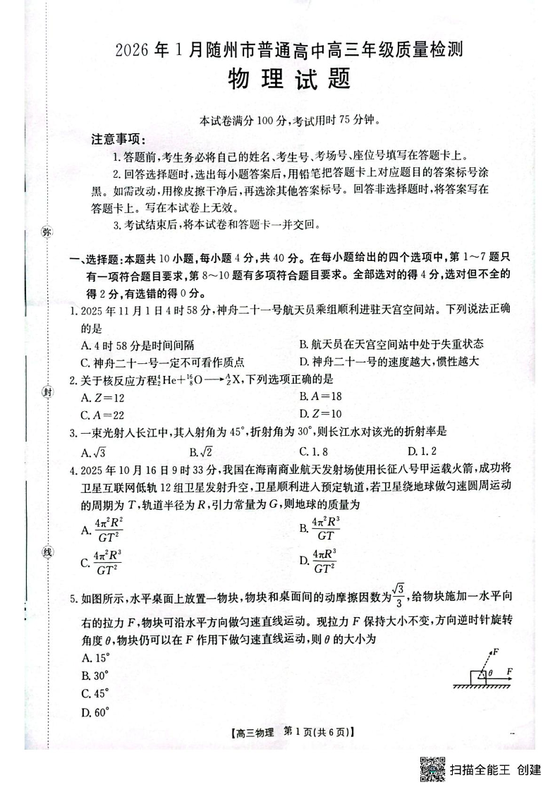 高三物理--湖北省随州市2026届高三上学期1月期末质量检测