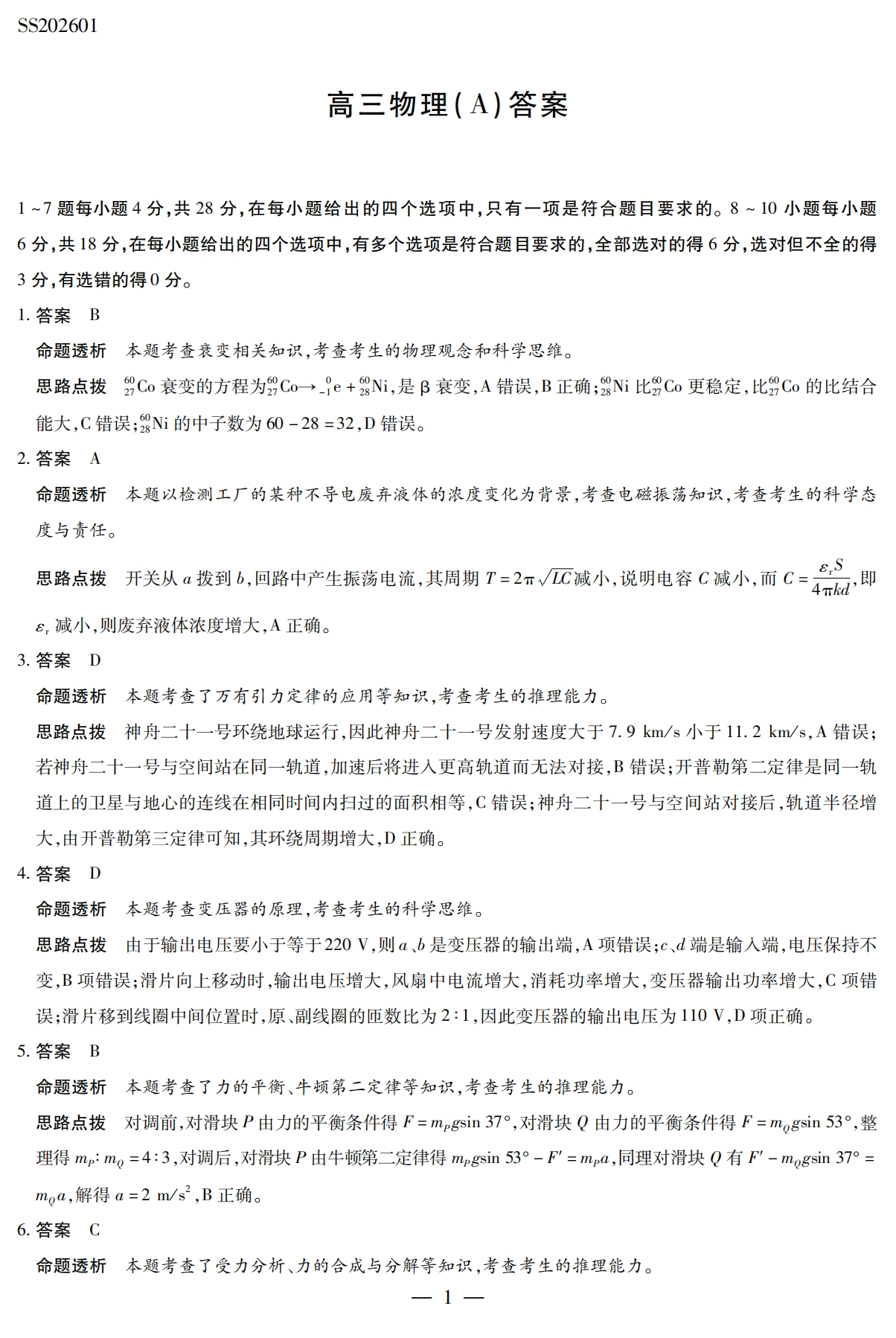 高三物理答案--陕西山西宁夏青海2026届高三学期1月四省联考