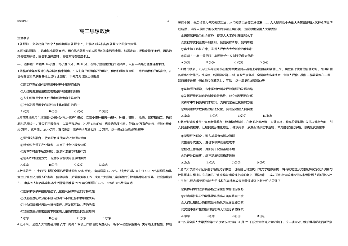 高三政治--陕西山西宁夏青海2026届高三学期1月四省联考