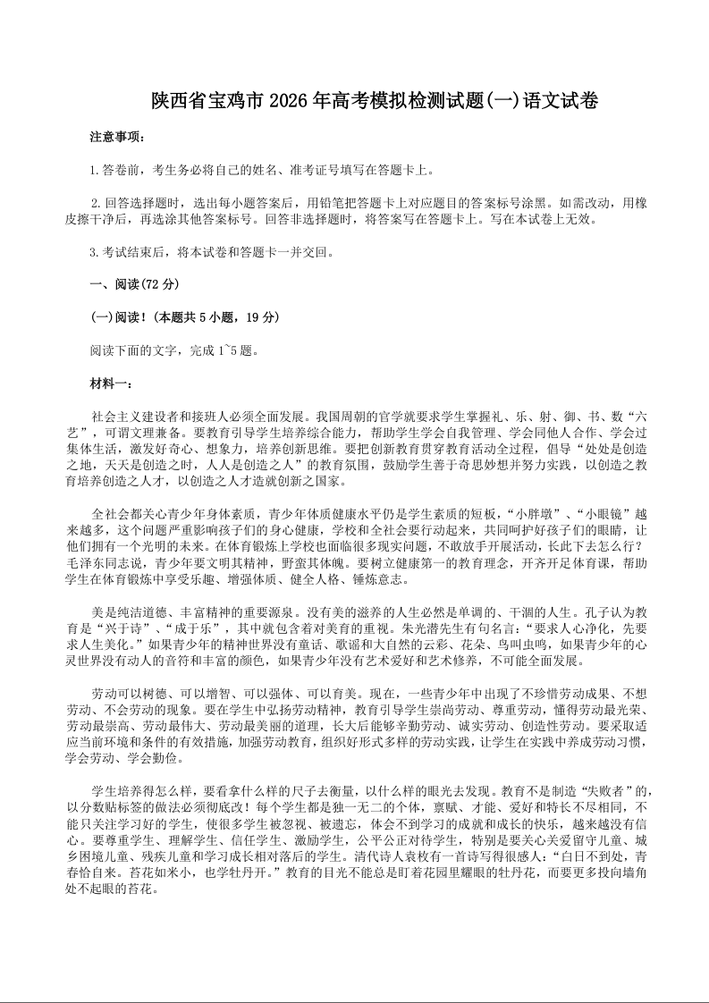 高三语文+答案--陕西省宝鸡市2026年高三高考模拟检测试题(一)(宝鸡一模)