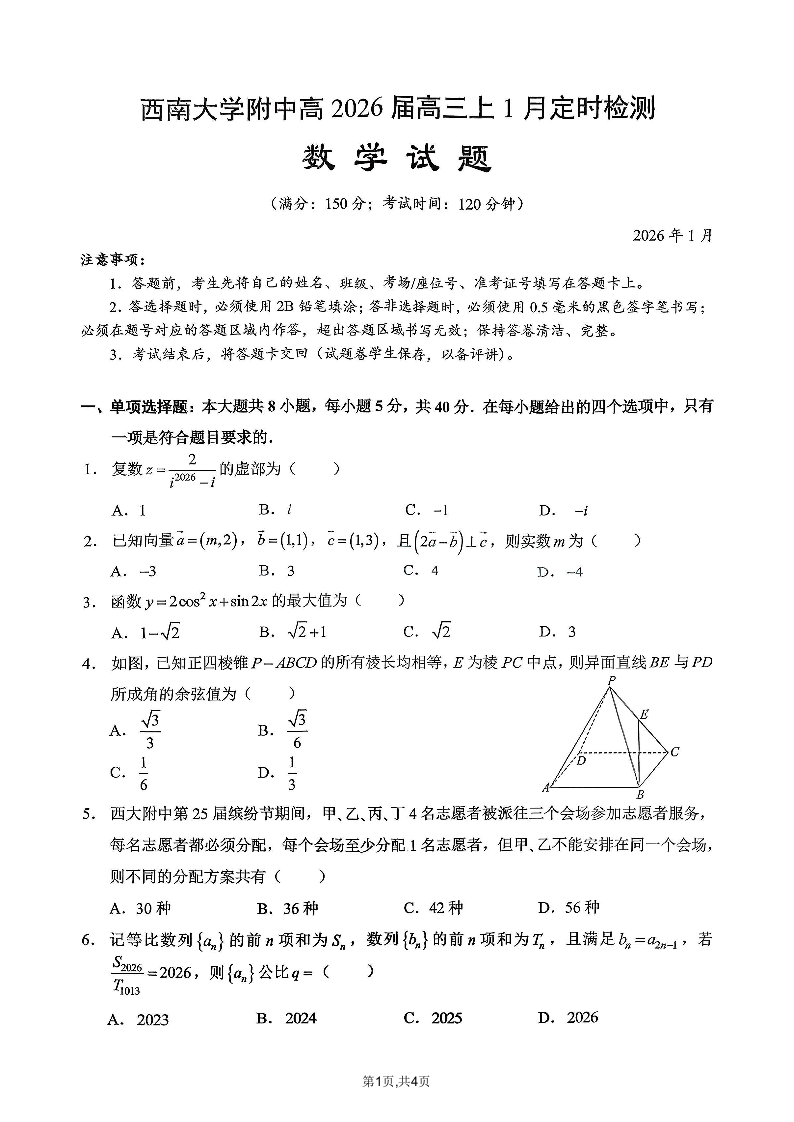 高三数学--重庆市西南大学附属中学2026届高三1月定时检测