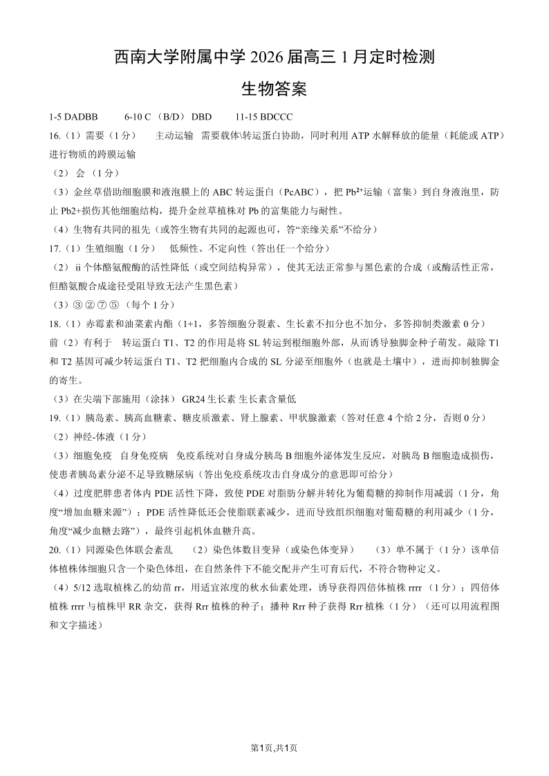 高三生物答案--重庆市西南大学附属中学2026届高三1月定时检测