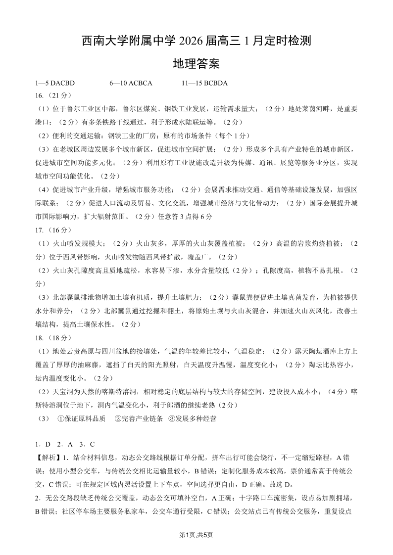 高三地理答案--重庆市西南大学附属中学2026届高三1月定时检测