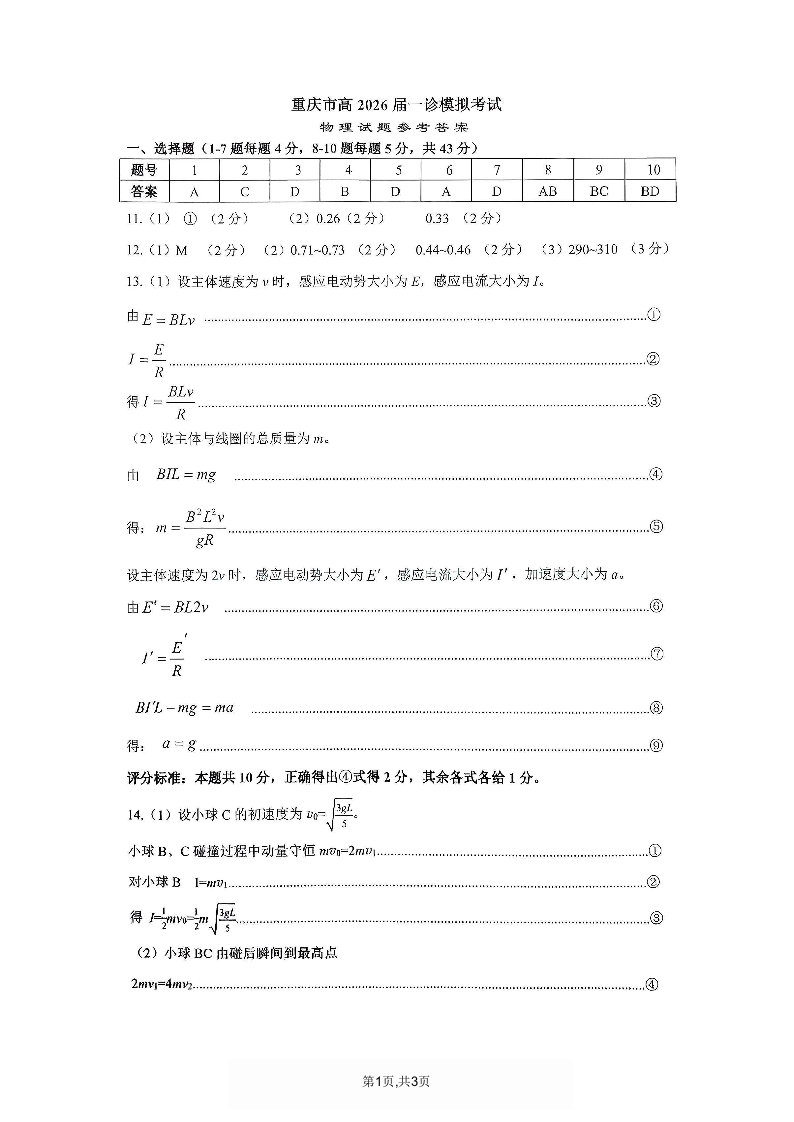高三物理答案--重庆市育才中学2026届高三1月一诊模拟考试
