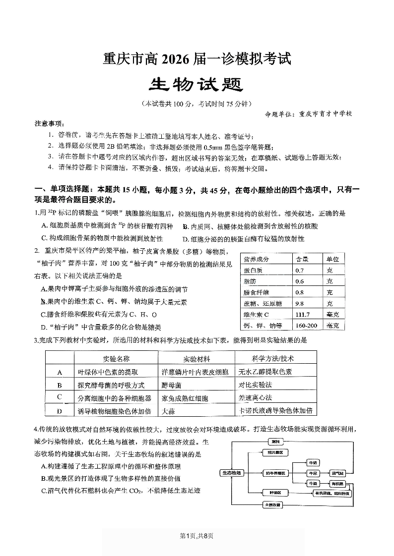 高三生物--重庆市育才中学2026届高三1月一诊模拟考试
