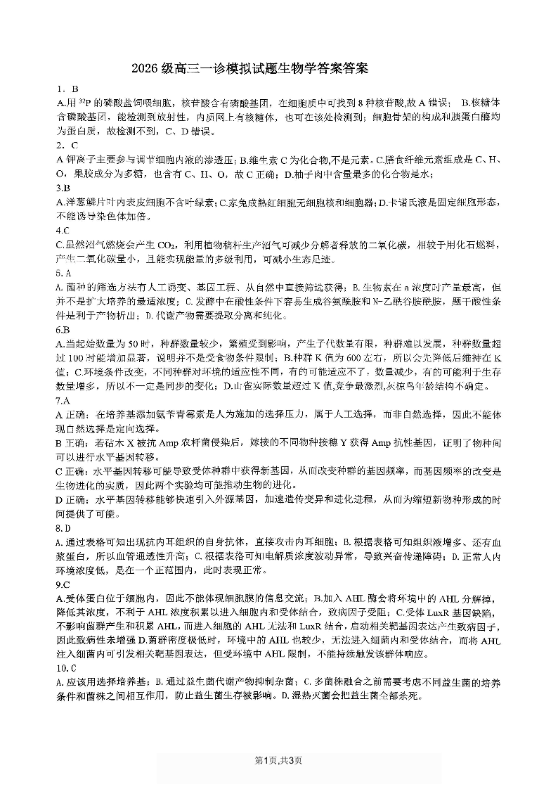 高三生物答案--重庆市育才中学2026届高三1月一诊模拟考试