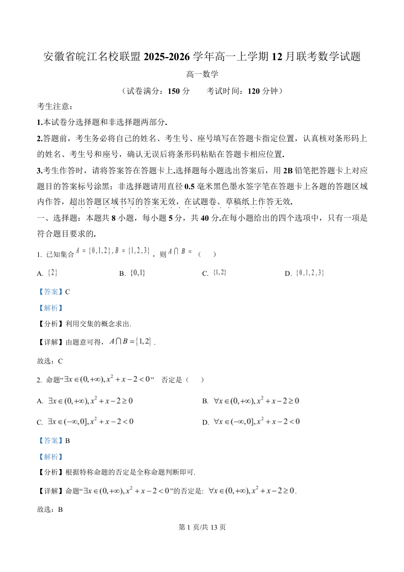 高一数学(解析版)--安徽省皖江名校联盟2025-2026学年高一上学期12月联考