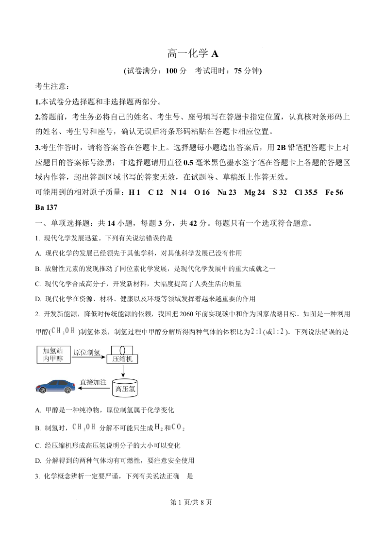 高一化学(原卷版)--安徽省皖江名校联盟2025-2026学年高一上学期12月联考