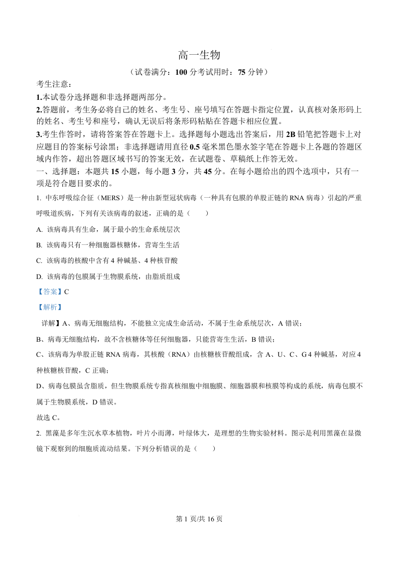 高一生物(解析版)--安徽省皖江名校联盟2025-2026学年高一上学期12月联考