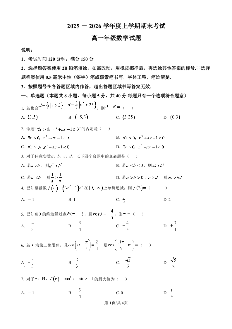 高一数学(原卷版)--黑龙江省大庆市大庆中学2025-2026学年高一上学期1月期末