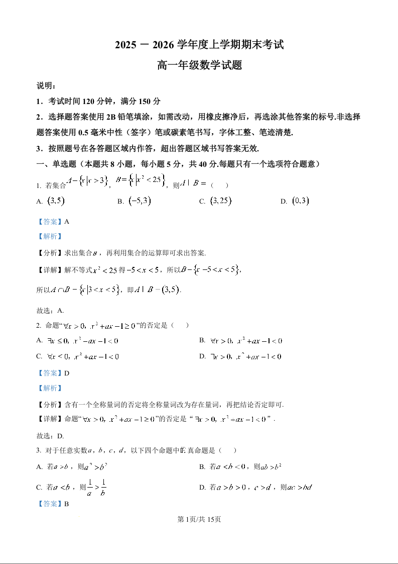 高一数学(精品解析版)--黑龙江省大庆市大庆中学2025-2026学年高一上学期1月期末
